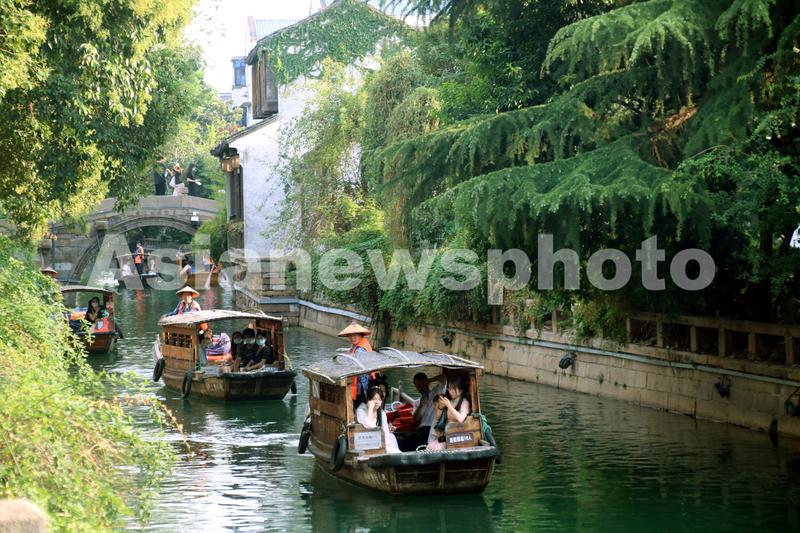 2022年9月12日,游客乘坐手摇小木船在江苏苏州平江路水巷游玩。中秋小长假期间,颇具特色的江苏苏州平江路水巷“水上游”特色项目深受青睐,游客乘坐手摇小木船水巷观光,在船工的吴歌声中饱览姑苏“小桥、流水、人家”美景,别有一番意境。