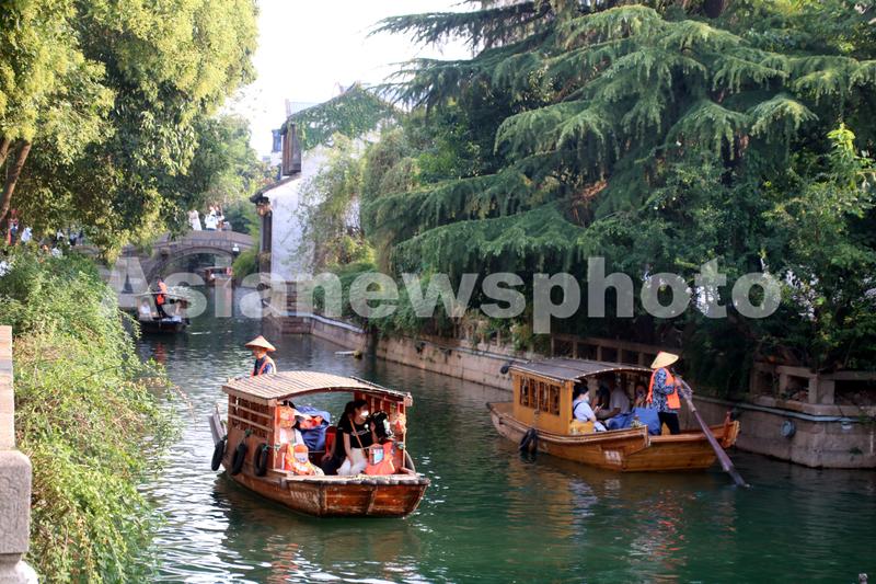 2022年9月12日,游客乘坐手摇小木船在江苏苏州平江路水巷游玩。中秋小长假期间,颇具特色的江苏苏州平江路水巷“水上游”特色项目深受青睐,游客乘坐手摇小木船水巷观光,在船工的吴歌声中饱览姑苏“小桥、流水、人家”美景,别有一番意境。