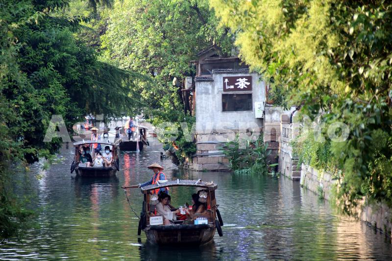 2022年9月12日,游客乘坐手摇小木船在江苏苏州平江路水巷游玩。中秋小长假期间,颇具特色的江苏苏州平江路水巷“水上游”特色项目深受青睐,游客乘坐手摇小木船水巷观光,在船工的吴歌声中饱览姑苏“小桥、流水、人家”美景,别有一番意境。