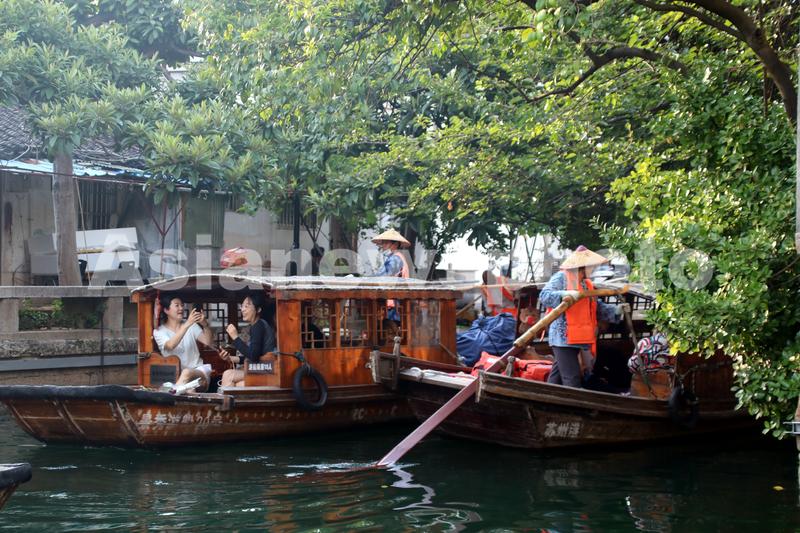 2022年9月12日,游客乘坐手摇小木船在江苏苏州平江路水巷游玩。