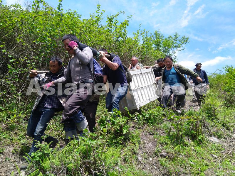 2020年5月18日,在中国大熊猫保护研究中心核桃坪大熊猫野化培训基地,工作人员转运野化培训大熊猫幼仔。