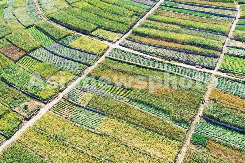 山东枣庄山亭区层层叠叠的梯田上谷子、高粱、花生、玉米等农作物渐趋成熟,色彩斑斓,勾勒出一幅美丽的丰收画卷。