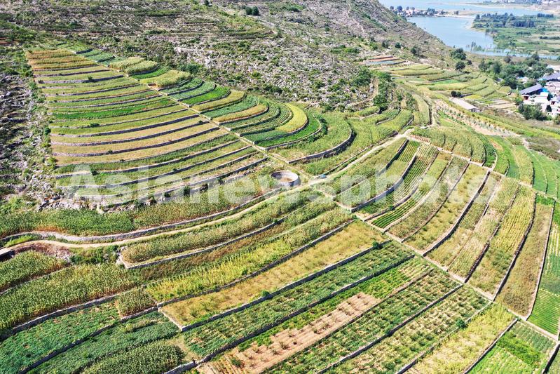 山东枣庄山亭区层层叠叠的梯田上谷子、高粱、花生、玉米等农作物渐趋成熟,色彩斑斓,勾勒出一幅美丽的丰收画卷。