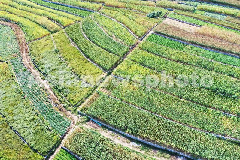 山东枣庄山亭区层层叠叠的梯田上谷子、高粱、花生、玉米等农作物渐趋成熟,色彩斑斓,勾勒出一幅美丽的丰收画卷。