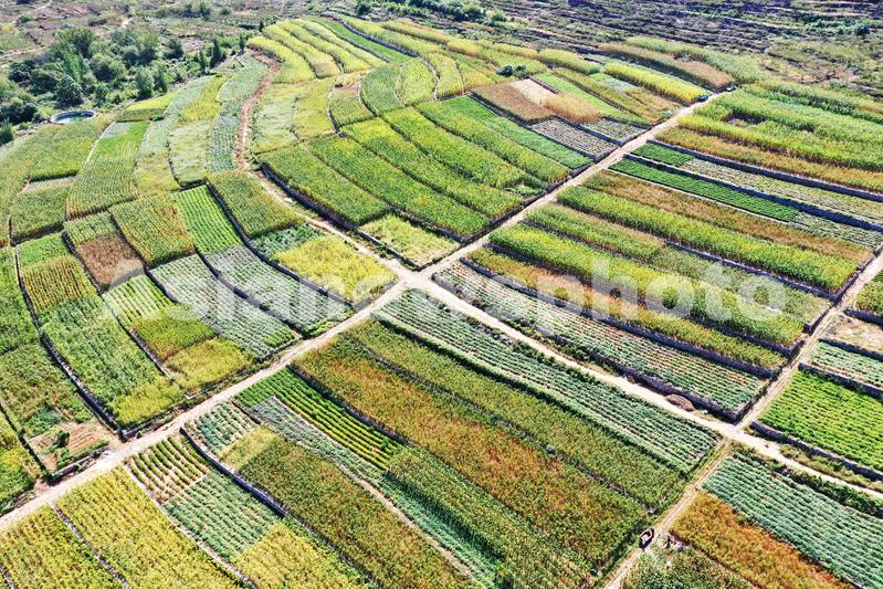 山东枣庄山亭区层层叠叠的梯田上谷子、高粱、花生、玉米等农作物渐趋成熟,色彩斑斓,勾勒出一幅美丽的丰收画卷。