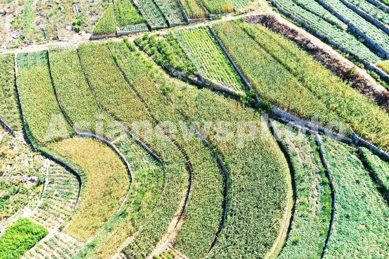 山东枣庄山亭区层层叠叠的梯田上谷子、高粱、花生、玉米等农作物渐趋成熟,色彩斑斓,勾勒出一幅美丽的丰收画卷。