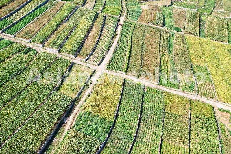 山东枣庄山亭区层层叠叠的梯田上谷子、高粱、花生、玉米等农作物渐趋成熟,色彩斑斓,勾勒出一幅美丽的丰收画卷。