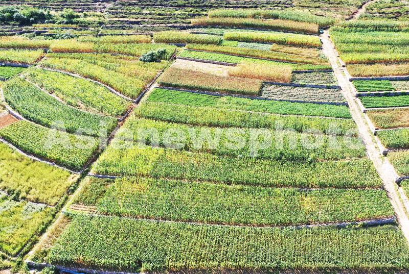 山东枣庄山亭区层层叠叠的梯田上谷子、高粱、花生、玉米等农作物渐趋成熟,色彩斑斓,勾勒出一幅美丽的丰收画卷。