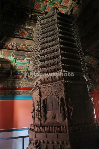 图片说明:图为万寿寺无量寿佛殿里的渗金多宝塔。