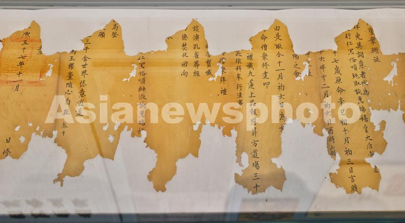 图片说明:图为在万寿寺修缮过程中发现的祭孝惠章皇后的疏文(残片)也首次与观众见面。