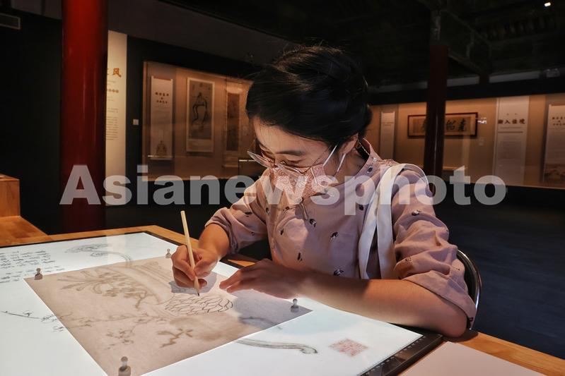 图片说明:在万寿寺大禅堂内,一位观众正饶有兴致地在画板上对照着电子化的《岁朝图卷》(乾隆帝御笔)进行临摹。