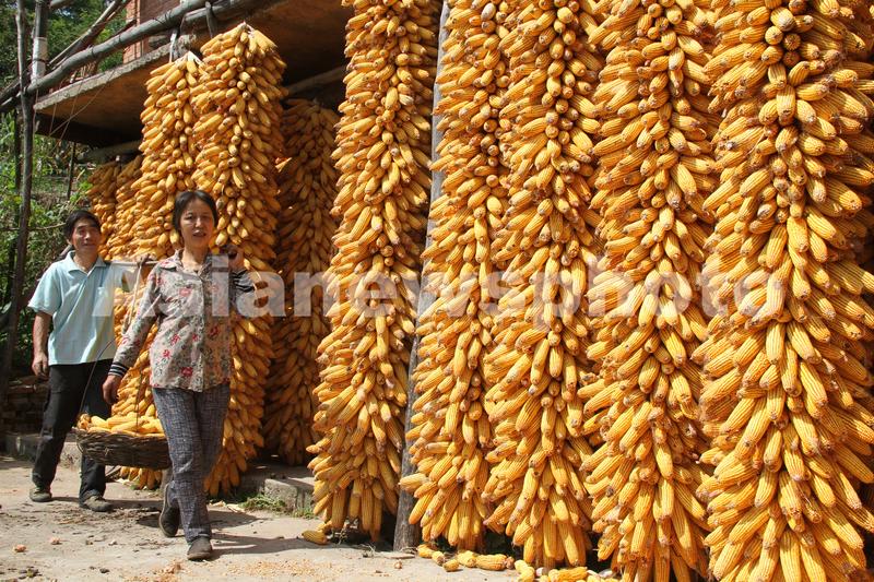 图片说明:9月18日,山西省晋城市阳城县风城镇后则腰村西山片区农民正在搬运晾晒玉米棒。