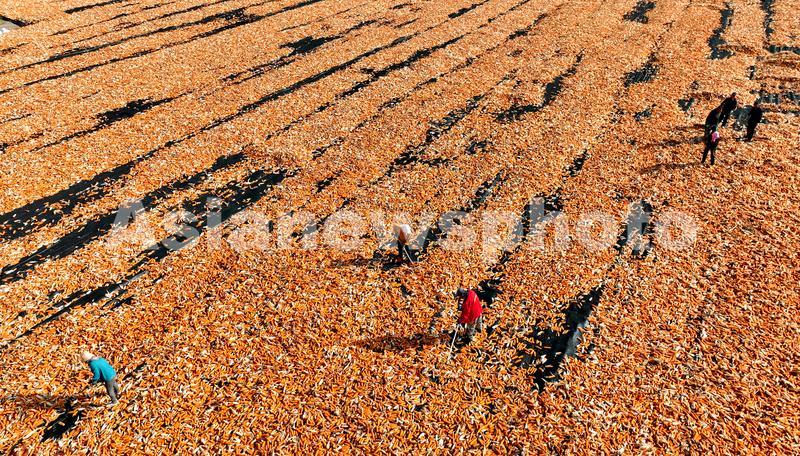 2022年9月21日,甘肃省张掖市甘州区三闸镇羊桥庙滩大晒场上,制种企业员工正抢抓晴好天气摊晒玉米种子,确保种子保质归仓。