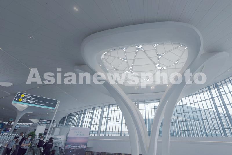 2022年9月22日,旅客过杭州萧山国际机场三期(T4航站楼)的“莲花谷”进入出发大厅。