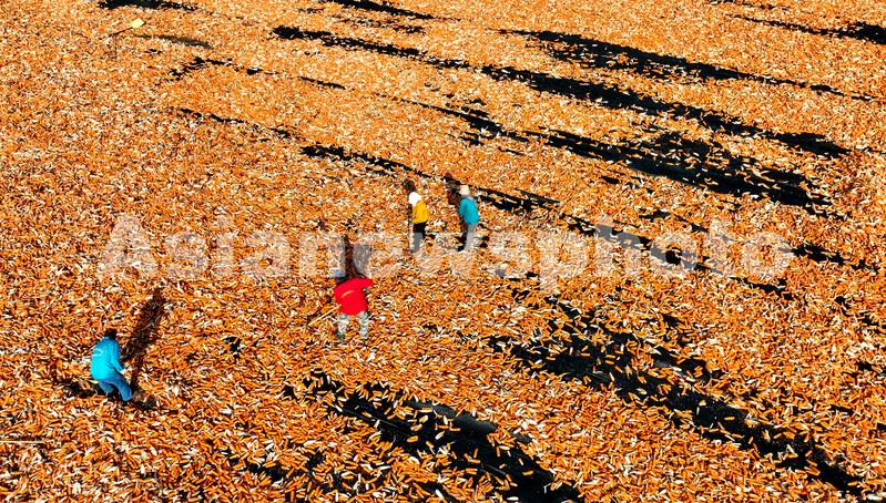 2022年9月21日,甘肃省张掖市甘州区三闸镇羊桥庙滩大晒场上,制种企业员工正抢抓晴好天气摊晒玉米种子,确保种子保质归仓。