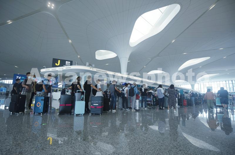 2022年9月22日,旅客在杭州萧山国际机场三期(T4航站楼)出发大厅排队值机。