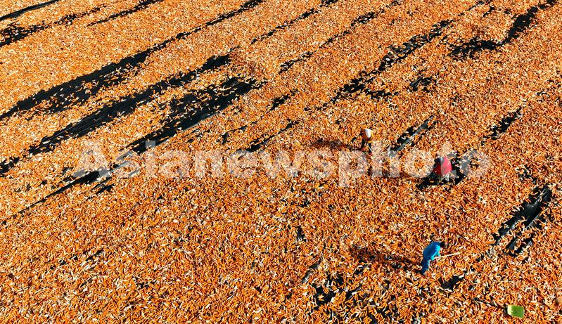 2022年9月21日,甘肃省张掖市甘州区三闸镇羊桥庙滩大晒场上,制种企业员工正抢抓晴好天气摊晒玉米种子,确保种子保质归仓。
