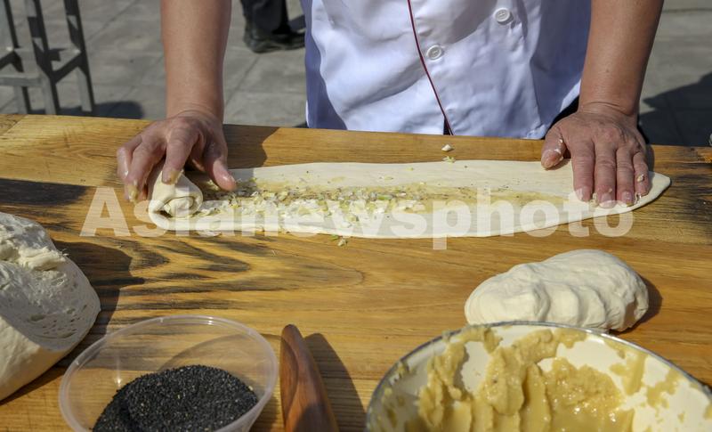 2022年9月23日,山西省运城市稷山县饼子技能大赛现场,选手正在加工葱花特色饼子。