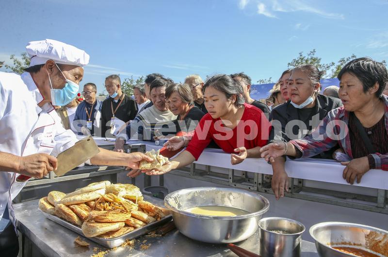 2022年9月23日,山西省运城市稷山县饼子麻花技能大赛现场,市民品尝刚刚制作好的油酥饼子。