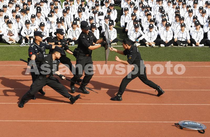2022年9月23日,在安徽省亳州职业技术学院,公安特警正在为学生们演示反恐防暴技能。