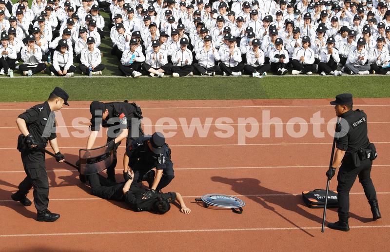 2022年9月23日,在安徽省亳州职业技术学院,公安特警正在为学生们演示反恐防暴技能。