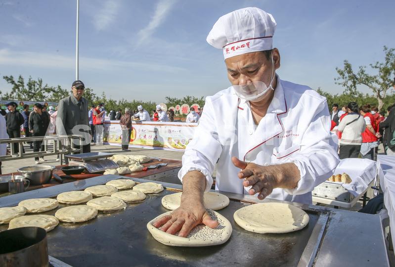 2022年9月23日,山西省运城市稷山县饼子技能大赛在该县国家板枣公园举行,参赛选手正在环保型烤炉上加工饼子。