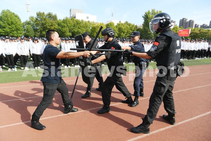 2022年9月23日,在安徽省亳州职业技术学院,公安特警正在为学生们演示反恐防暴技能。当日,安徽省亳州职业技术学院举行反恐防暴专题教育活动,公安特警向大学生们现场展示、讲解正确使用盾牌、钢叉、警棍等防爆器材的使用方法。通过开展校园反恐防暴演练,增强师生的反恐防暴安全意识和自护自救能力,进一步加强“平安校园”建设,为营造安全、和谐的校园环境奠定了坚实基础。