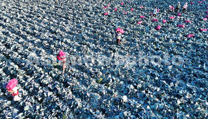图片说明:2022年9月25日,在甘肃省张掖市甘州区上秦镇付家寨村千亩蔬菜种植基地,菜农正在采收、装车紫甘蓝。