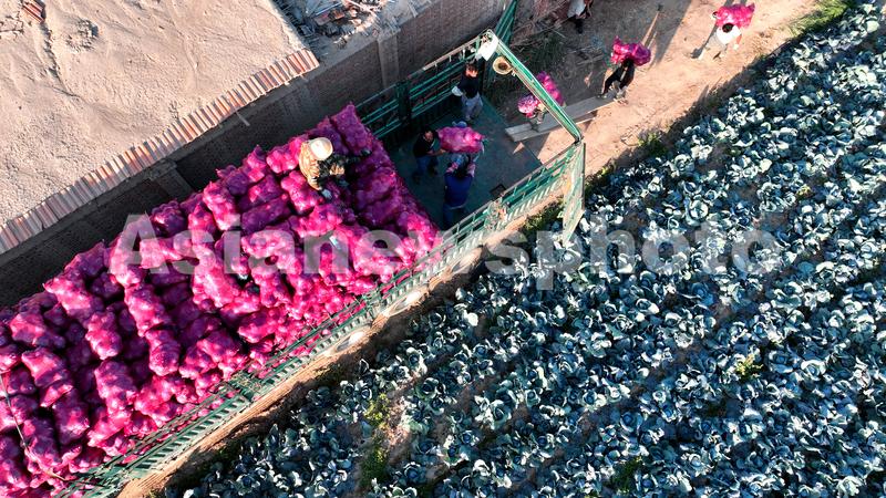 图片说明:2022年9月25日,在甘肃省张掖市甘州区上秦镇付家寨村千亩蔬菜种植基地,菜农正在装车紫甘蓝。