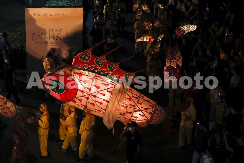2022年9月23日,鱼灯表演队伍在安徽省黄山市歙县徽州古城内巡游。