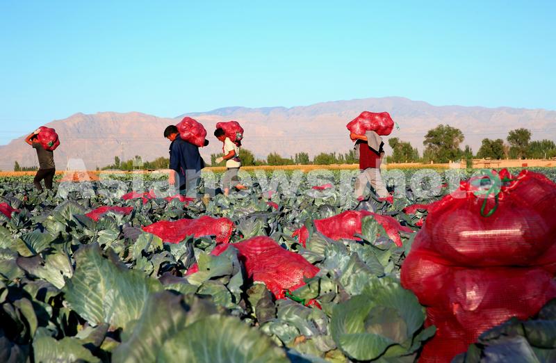 图片说明:2022年9月25日,在甘肃省张掖市甘州区上秦镇付家寨村千亩蔬菜种植基地,菜农正在采收、装车紫甘蓝。