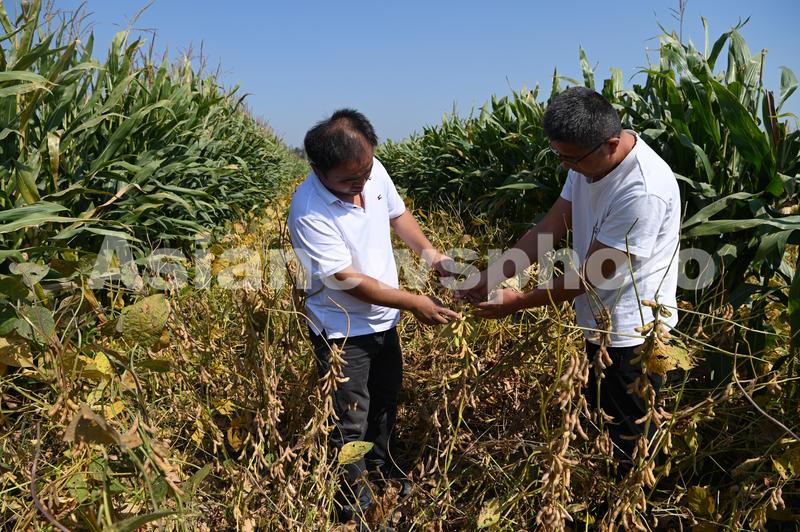 图片说明:2022年9月28日,在山东省聊城市东昌府区闫寺街道辛王顺丰家庭农场,工作人员在查看即将成熟的采用大豆玉米复合种植技术种植的大豆。