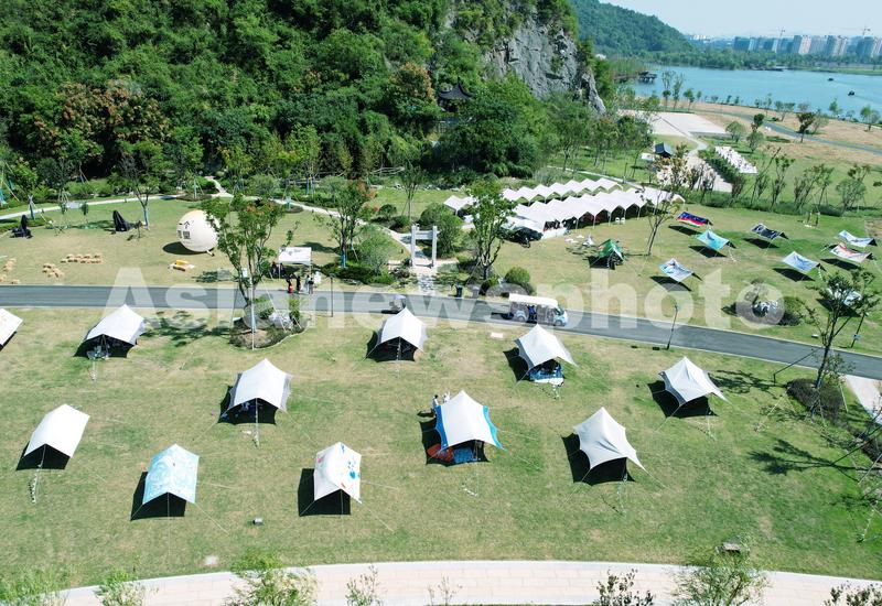 2022年10月3日,游客在杭州铜鉴湖景区搭建的露营帐篷下乐享国庆假期。