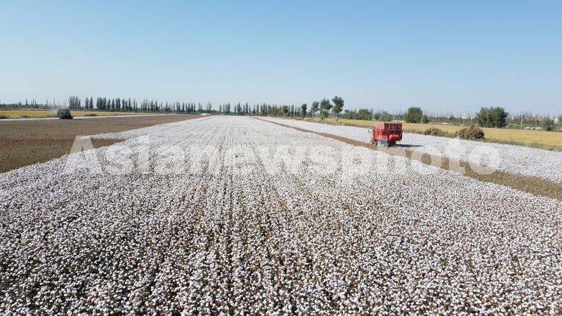 图片说明:国产采棉机在新疆生产建设兵团第一师二团棉田作业(2022年9月28日摄)。