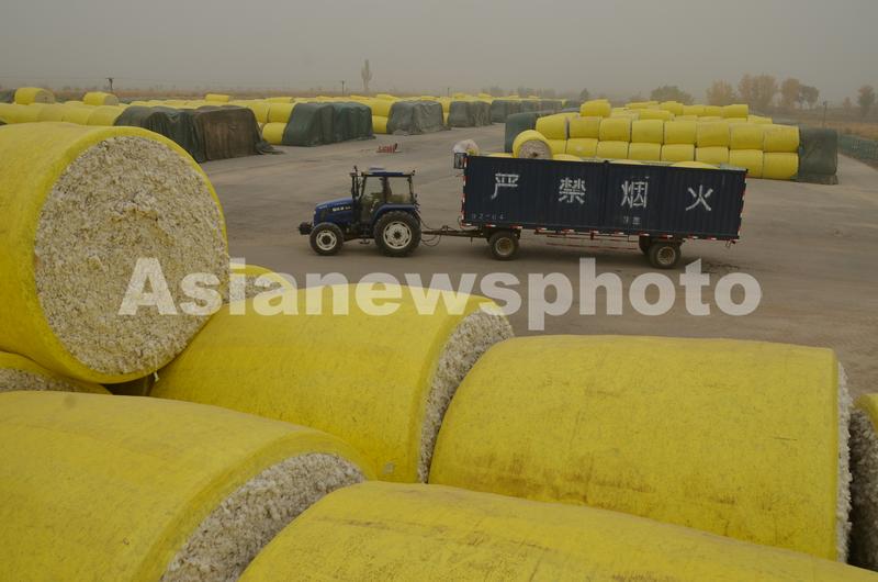 图片说明:拖拉机拉运棉包交售到新疆生产建设兵团第一师二团棉花加工厂(2014年10月30日摄)。