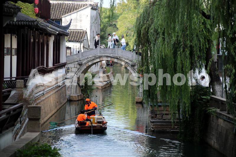 图片说明:2022年10月10日,清洁工人在江苏省苏州市平江河面上打捞水上漂浮物。