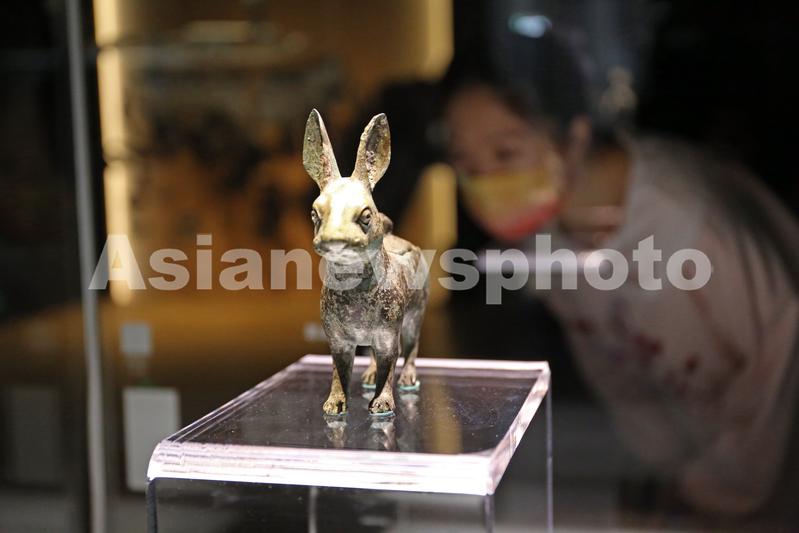 2022年10月12日,上海,闵行博物馆“盛世回归—海外回流文物特展”中的国宝青铜器立兔形典尊:西周時期兔形尊,是目前所知中国最早也是唯一一件立兔形尊,距今有2900年历史。