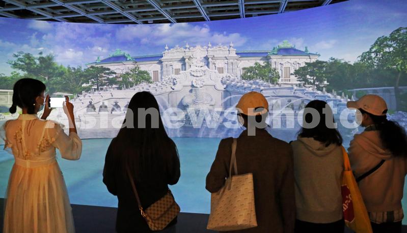 2022年10月12日,上海,闵行博物馆携手保利艺术博物馆、北京市海淀区圆明园管理处共同打造的“盛世回归—海外回流文物特展”上,用CG动画立体投影将目前遗址的砖块石柱、以及十二兽首铜像复原到了原来的位置,还原了圆明园“十二兽首水力钟”的历史盛景。