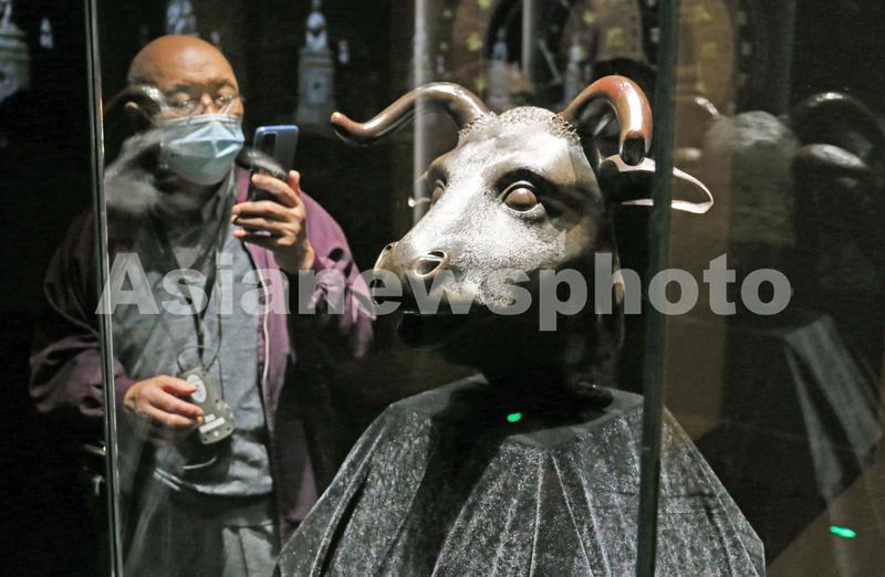 2022年10月12日,上海,闵行博物馆“盛世回归—海外回流文物特展”中的珍贵国宝(圆明园十二生肖兽首铜像牛首)吸引游客。
