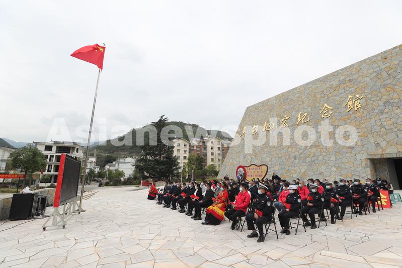 2022年10月16日,云南省昭通市鲁甸县龙头山镇干部群众在地震纪念馆前集中收看党的二十大开幕会实况直播。