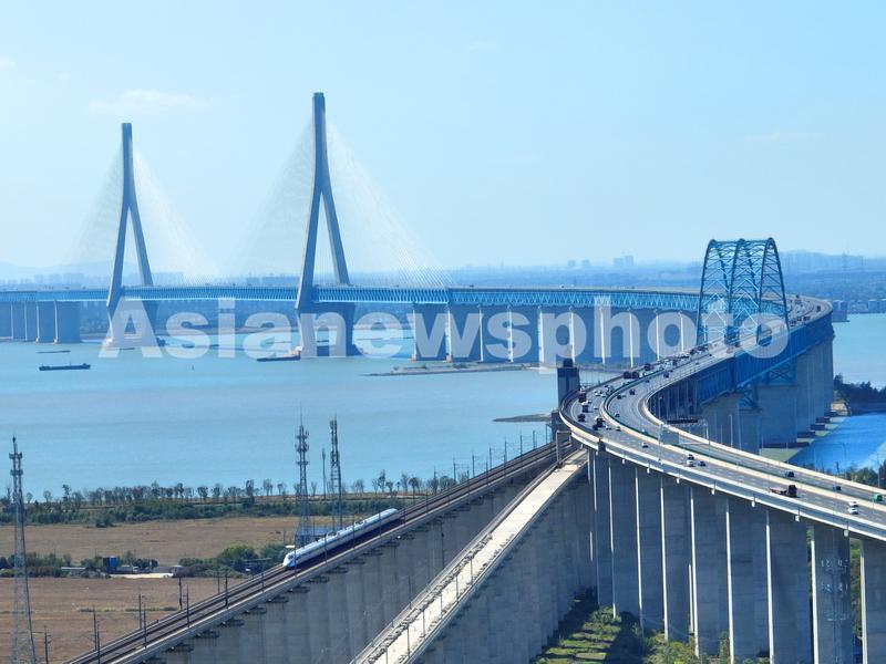 2022年10月18日,动车组列车驶出沪苏通铁路跨长江控制性工程沪苏通长江公铁大桥。