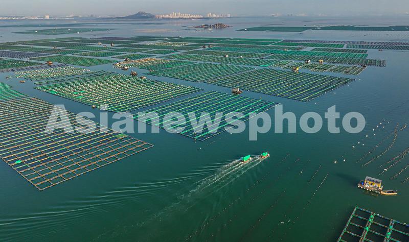 2022年10月20日,在山东省荣成市石岛管理区桑沟湾海洋牧场网箱养殖区,渔民们迎着朝霞驾驶着渔船、舢舨出海进行各类养殖作业,呈现出一派“海上秋耕”生产的繁忙景象。