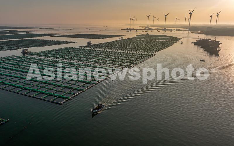 2022年10月20日,在山东省荣成市石岛管理区桑沟湾海洋牧场网箱养殖区,渔民们迎着朝霞驾驶着渔船、舢舨出海进行各类养殖作业。