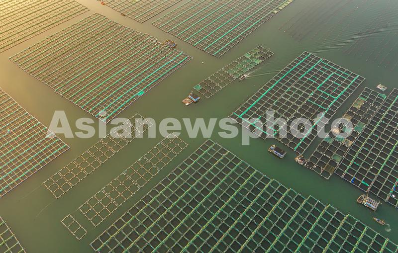 2022年10月20日,在山东省荣成市石岛管理区桑沟湾海洋牧场网箱养殖区,渔民们迎着朝霞驾驶着渔船、舢舨出海进行各类养殖作业,呈现出一派“海上秋耕”生产的繁忙景象。