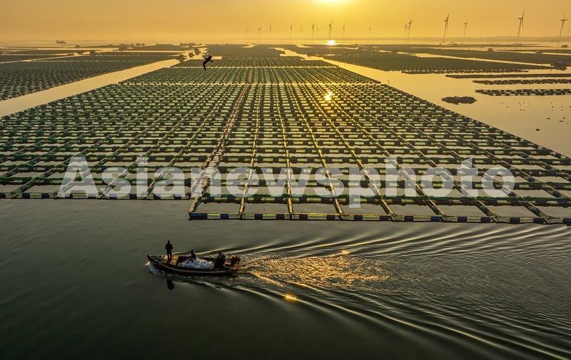2022年10月20日,在山东省荣成市石岛管理区桑沟湾海洋牧场网箱养殖区,渔民们迎着朝霞驾驶着渔船、舢舨出海进行各类养殖作业。