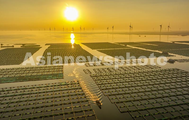 2022年10月20日,在山东省荣成市石岛管理区桑沟湾海洋牧场网箱养殖区,渔民们迎着朝霞驾驶着渔船、舢舨出海进行各类养殖作业。