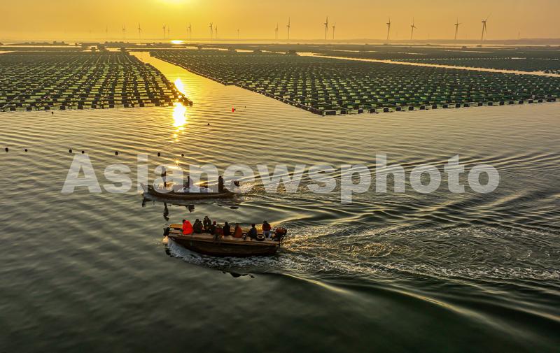 2022年10月20日,在山东省荣成市石岛管理区桑沟湾海洋牧场网箱养殖区,渔民们迎着朝霞驾驶着渔船、舢舨出海进行各类养殖作业。