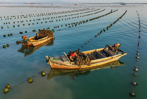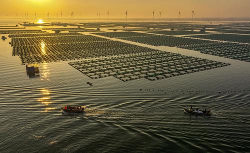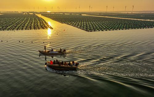 2022年10月20日,在山东省荣成市石岛管理区桑沟湾海洋牧场网箱养殖区,渔民们迎着朝霞驾驶着渔船、舢舨出海进行各类养殖作业,呈现出一派“海上秋耕”生产的繁忙景象。