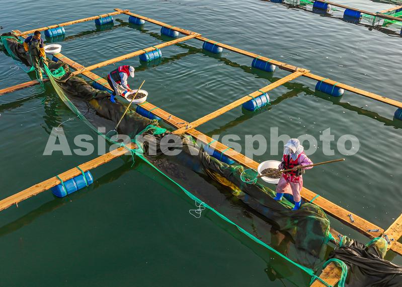 2022年10月20日,在山东省荣成市石岛管理区桑沟湾海洋牧场网箱养殖区,渔民们迎着朝霞驾驶着渔船在收获海参。