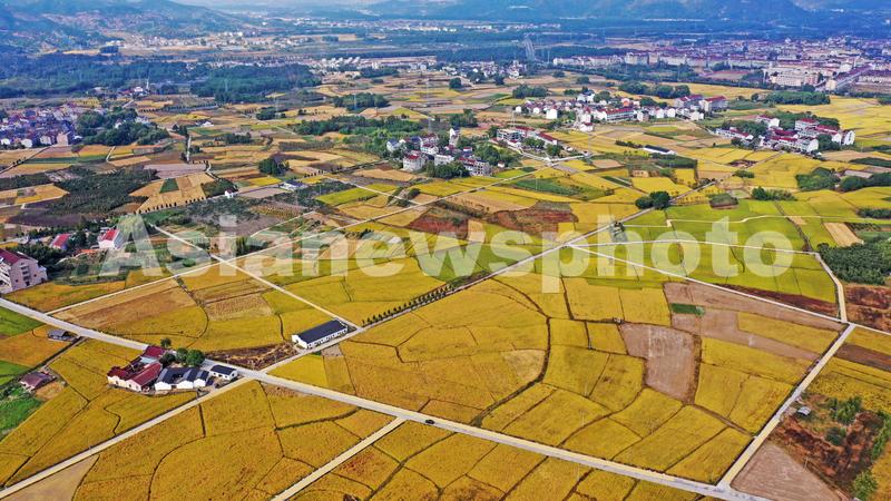 图片说明:2022年10月22日,浙江省台州市仙居县白塔镇农田成片金黄的水稻与村庄、阡陌纵横的道路交织在一起,勾勒出一幅田园丰收、乡村美丽新画卷。